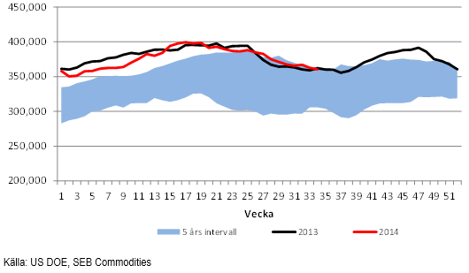 Råoljelagren i USA sjönk 2 mbbl till 360.5 mbbl. Nu är lagernivån faktiskt 1.5 mbbl lägre än samma vecka förra året.