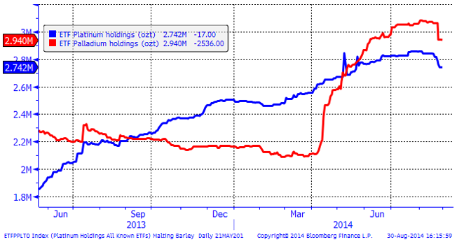 Nedanför ser vi hur mycket metall som finns i börshandlade fonder för platina respektive palladium. So vi ser har folk tagit hem sina vinster i båda den senaste veckan.