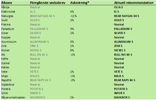 Pga tilltagande geopolitisk oro tror vi att ädelmetaller och olja är bra att vara köpt på råvarumarknaden. Det finns ingen uppenbar råvara att vara kort den här veckan. SILVER S och OLJA S är alltså de rekommendationer vi vill lyfta fram.