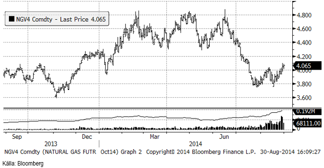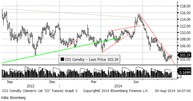 Oljepriset har brutit motståndet för den nedgång som varit sedan juni. Vi tror att det finns potential för uppsida och det motiveras bland annat av att OPEC har producerat maximalt och det finns en viss sårbarhet med ISIS som motor i MENA. Libyen känns också skakigt då t ex den amerikanska ambassaden i Tripoli intogs i helgen. Slutligen har vi Ryssland/Ukraina-krisen och vinter på norra halvklotet på väg.