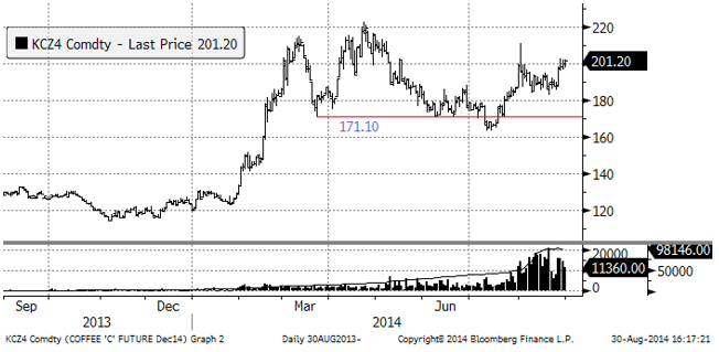 Det är inga större nyheter på kaffefronten. Tekniskt ser vi att priset på decemberkontraktet tagit sig upp till 200 cent. Möjligen kommer priset att gå upp till 220 cent, där ett starkt motstånd finns. Fundamentalt ser vi dock inte något som talar för högre pris på kaffe.