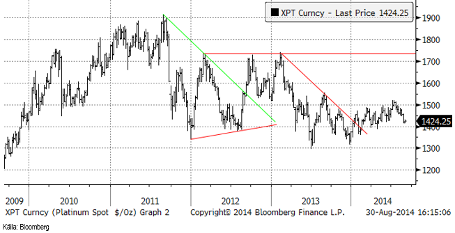 Silver är vår favorit bland alla råvaror. Dels är har priset varit i konsolidering under mer än ett års tid efter prisfallet från toppnoteringen för tre år sedan, dels gynnas ädelmetaller av den förnyade och tilltagande geopolitiska oron och slutligen är silver billigt i förhållande till guld. Motståndet för nedgången från toppen 2011 är ännu inte bruten, men om eller när det sker, kan prisuppgången bli snabb och stor.
