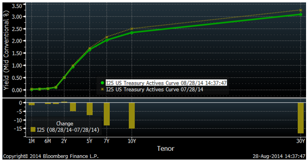 Det talas om att räntorna är på väg uppåt i USA, men detta är inte något man ser i marknaden. Nedan ser vi räntekurvorna för amerikanska statspapper, där det tydligt framgår att räntorna generellt sett är lägre än för en månad sedan med ungefär 15 räntepunkter för 10 och 30 års obligationer.