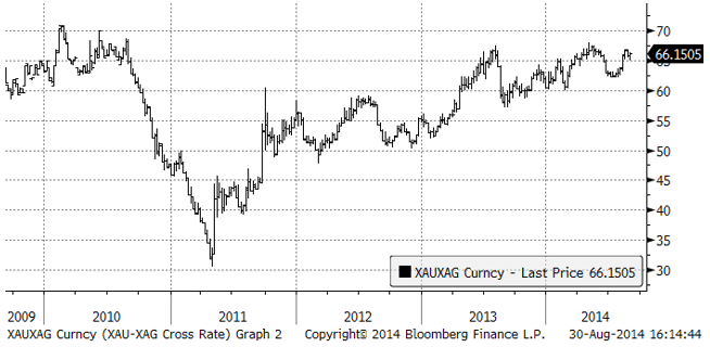 Det som särskilt lockar investerare till silver framför guld just nu är att silver är historiskt billigt jämfört med guld. Nedan ser vi ett diagram över priset på guld uttryckt i silver.