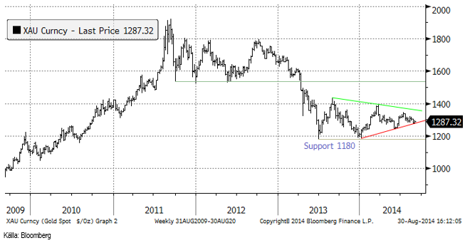 Priset på guld ligger fortfarande och testar den nedre gränsen i den triangelformation som bildats sedan mitten av förra året. Det är ännu oklart om det kommer att bli ett utbrott på nedsidan eller på uppsidan. Just nu är det som sagt väldigt nära till ett brott nedåt. Det innebär att taktiken är att köpa, men vara beredd att snabbt ta förlusten om det blir ett brott på nedsidan.