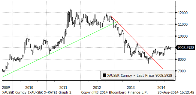 Nedan ser vi guldpriset i svenska kronor per uns. Guld ser mer ”bullish” ut ur ett svenskt perspektiv, än ur ett dollarperspektiv.