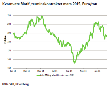 Vete på Matif backade initialt under måndagen och pressades av prisfall i det amerikanska vetet, en starkare euro och det stora globala utbudet av vete. Vi såg dock en återhämtning i priset redan dagen efter då köpare i den internationella marknaden, bland annat Egypten och Saudiarabien, drar nytta av de låga prisnivåerna. Rapporter om ogynnsamt väder för höstvete i USA och i Ryssland var också en bidragande faktor.
