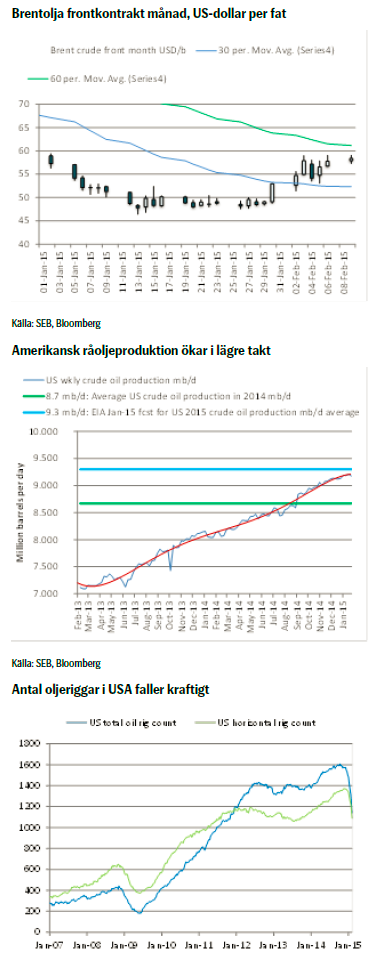 Sedan förra måndagen har priset på Brentolja fortsatt sin starka uppgång med en ökning om 6,9 procent. Den senaste prisnoteringen på ca 58 US-dollar/fat. Antalet amerikanska oljeriggar fortsatte att falla kraftigt under förra veckan vilket visade marknaden att ett lägre oljepris verkligen leder till en reaktion på utbudssidan: Oljeproducenterna skär ned på kostnader genom att använda färre riggar och i mindre omfattning oljeutvinnande aktiviteter, vilket till slut kommer att leda till en lägre produktion och därför stigande oljepriser. Marknaden har också mot bakgrund av detta tagit ett hopp uppåt.