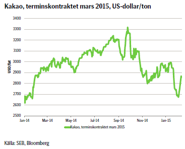 Med blicken i backspegeln så kan vi konstatera att priset på kakao har stigit kraftigt under veckan som har gått och framförallt har fundamentala faktorer varit drivit priset uppåt. Prisrallyt har orsakats av amerikansk statistik (försäljning) som visar på en ökad efterfrågan i kombination med rapporter om torrt väder i delar av Östafrika, bland annat hos de stora producenterna Ghana och Elfensbenskusten där lägre skördar förväntas. En minskad produktion bör dock inte vara alltför prisdrivande då rapporter ändå visar på en minskad efterfrågan inom industrin. Detta överensstämmer med International Cocoa Organization’s prognos att produktionen bör matcha efterfrågan denna säsong.