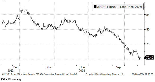 Nedan ser vi terminspriset för kalenderåret 2015 avseende energikol. Förra veckan skrev vi att ett nytt test av 71-dollarsnivån var inom räckhåll. Priset föll i veckan ytterligare från 71.65 till 70.40 dollar. Fredagens prisrörelse var dock väldigt stark – och kan signalera förestående styrka i marknaden.
