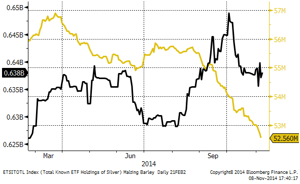 Institutionella investerare fortsätter att sälja av guldfonder – faktiskt i en allt snabbare takt nu i november. Dessa verkar inte vara ”value investors”, utan snarare trendföljare, vilket jag har påpekat tidigare. De är orsakar inte prisrörelser genom sitt agerande, utan deras agerande orsakas av prisrörelsen. Det är väldigt typiskt för den här kategorin av placerare. Detta har visats av en rad studier, bland annat av IMF (2006) och OECD (2010).