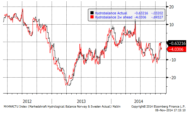 Hydrologisk balans har enligt 2-veckors prognosen fallit tillbaka något, till ett underskott på 4 TWh.