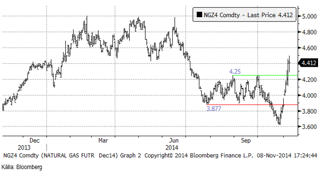 Naturgaspriset (decemberkontraktet) fortsatte tyvärr upp från 3.87 till 4.42, dvs med hela 14%! Prisrörelsen gick rakt genom de tekniska nivåerna 3.877 och 4.25 och hejdades inte förrän vid 4.50. Nu är 4.25 ett tekniskt stöd. Vi tror inte att priset går genom 4.50 och det logiska blir därför att behålla BEAR NATGAS X4 S.