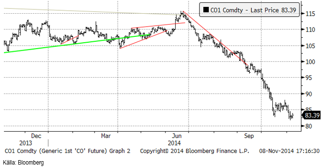 Vi tror att oljan kommer att handlas svagt fram till OPEC-mötet i Wien den 27 november. Det finns en liten chans (30% uppskattningsvis) att Iran finner en lösning den 24 november, men förhandlingarna kommer att fortsätta och sannolikheten för en lösning de kommande 1 – 2 åren är nog ganska goda. Det är låg sannolikhet att OPEC-medlemmarna enas om en minskning av sin produktion den 27 november. Det blir antagligen mycket stök och en säkert en del uttalanden som kan skrämma marknaden, men logiken säger att det inte kommer att bli någon överenskommelse. Om det blir riktigt låga priser under det första halvåret nästa år kan det möjligen bli en överenskommelse vid OPEC-mötet i maj.