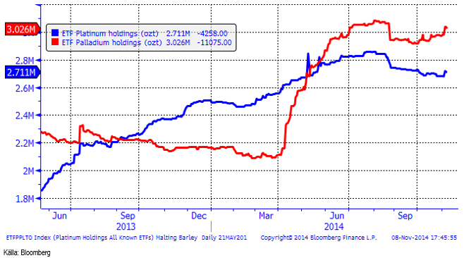 Nedanför ser vi hur mycket metall som finns i börshandlade fonder för platina respektive palladium. Investerare har ökat på innehaven i båda metallerna, framförallt i palladium.