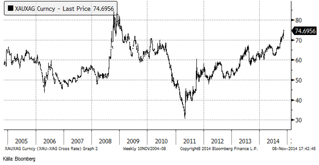 Silver är fortsatt billigt i förhållande till guld och det kan vara en anledning att byta en investering i guld mot silver. Sedan förra veckan har kvoten gått från 72.6 till 74.7! Rekordet är 84.5 och noterades i oktober 2008 – när guldpriset steg pga finanskrisen.