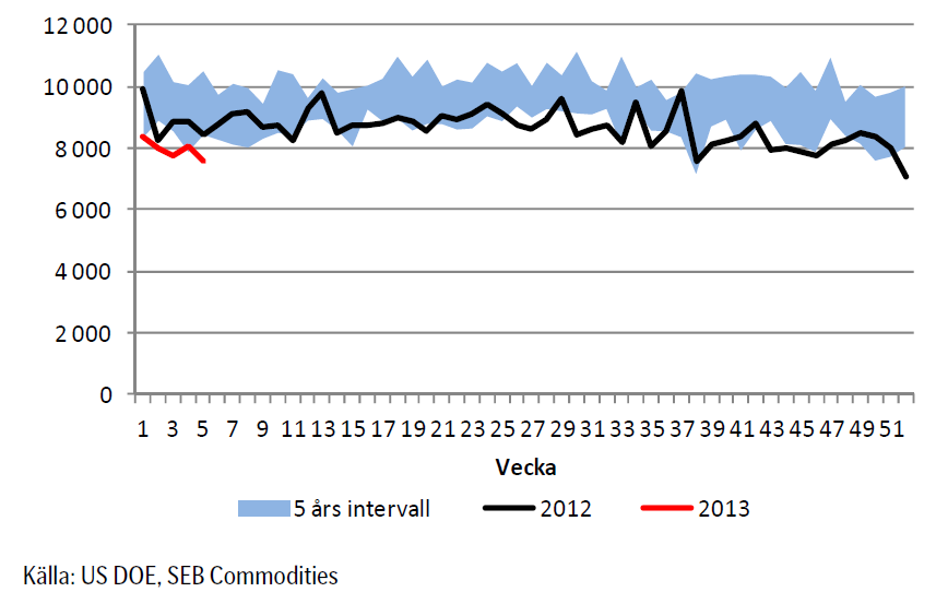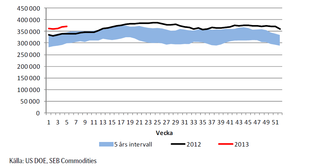 Råoljelagren fortsatte att byggas på. Nedan ser vi amerikanska råoljelager enligt DOE i tusen fat. Den svarta kurvan är 2012 års lagernivåer vecka för vecka och den lilla röda linjen är 2013 års nivå. Vi ser att lagernivåerna fortsätter att vara högre än de varit sedan 2007 för den här tiden på året.