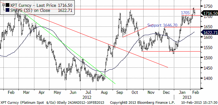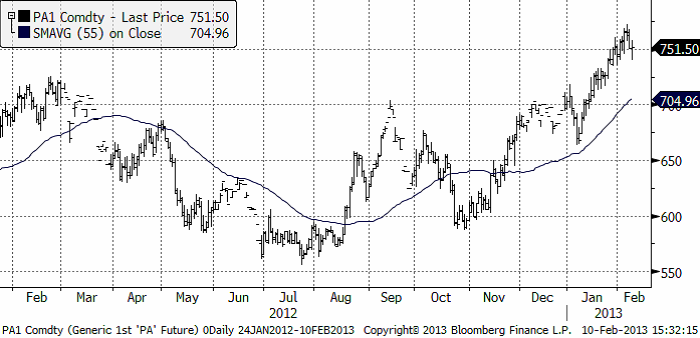Palladium fortsatte stiga i början på förra veckan, men föll sedan tillbaka på vinsthemtagningar. Det ser ut som om uppgångsfasen från 700 dollar till 750 kan tänkas behöva en konsolidering vid dessa nya nivåer, innan priset kan fortsätta upp. Men trenden är definitivt uppåtriktad och rekyler bör hellre betraktas som köptillfällen, än som en orsak att lämna marknaden.