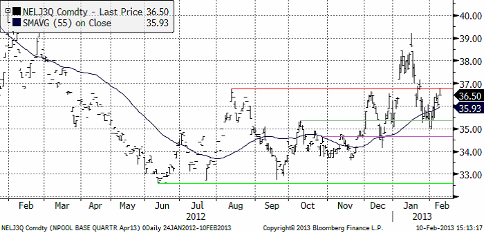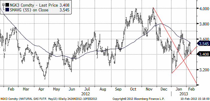 Naturgasterminen på NYMEX (mars 2013) gick först upp i början av förra veckan, och föll sedan tillbaka ner. Veckans uppgång nådde inte lika långt som uppgången innan. Det är ett svaghetstecken. Den uppåtgående stödlinjen bröts sedan i fredags. Det är bara precis ett brott, och kanske inte ska säljas på rakt av. Men skulle priset falla under 3.40 i början av veckan som nu börjar, får vi nog tolka det som en kortsiktig säljsignal från den tekniska analysen.