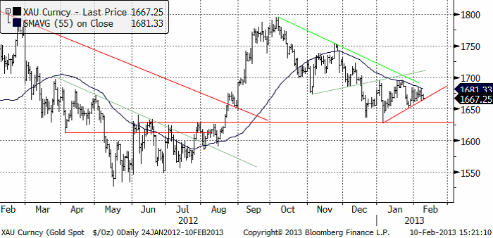 Vi noterar också att guldmarknaden forsätter att bilda ”trianglar” i sin pendling uppåt och nedåt. Det innebär att ett brott uppåt omedelbart genererar en köpsignal. Skulle priset med andra ord gå upp till över 1700 dollar, har vi en köpsignal. Just nu är dock den senaste signalen en säljsignal. Med reservation för att det kan bli en snabb rekommendationsförändring, håller vi fortfarande fast vid den säljrekommendation vi haft sedan december.