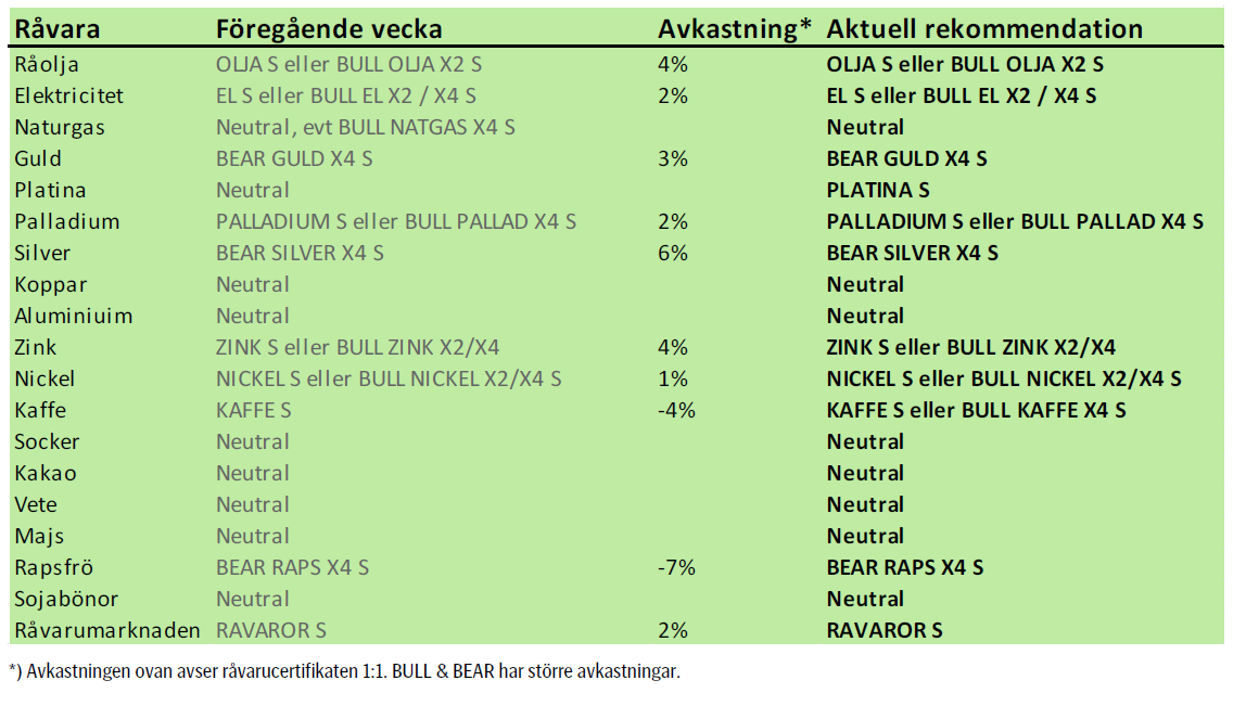 Råvaruindex i svenska kronor steg med 2%, vilket medförde att råvaruindex-certifikatet RAVAROR S steg lika mycket. Aktiemarknaden hade däremot en blandad vecka, där i synnerhet råvarubolaget SSAB:s rapport fick aktien på fall. Råvaror och aktier är inte samma sak, som bekant.