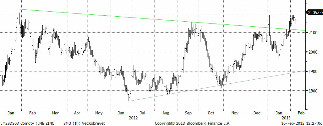 Priserna föll 2-3 % för att under torsdagen och fredagen återhämta, och således stänga oförändrade. Undantaget är favoriten zink som trots en rejäl rekyl stänger upp 1,6 %. Marknaden fick en extra impuls av fredagens handelssiffror från Kina som visade en 25 % -ig ökning av exporten i januari. Importsiffrorna var också starka med en ökning med 28 %, det senare och beror säkert på att ”bokningar” gjorts före det kinesiska nyårsfirandet nästa vecka. Med många kinesiska aktörer på ledighet nästa vecka förväntas volymerna vara begränsade, vilket i sig kan skapa lite oförutsedda prisrörelser. Men troligast är avvaktande handel.