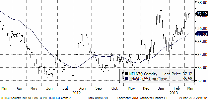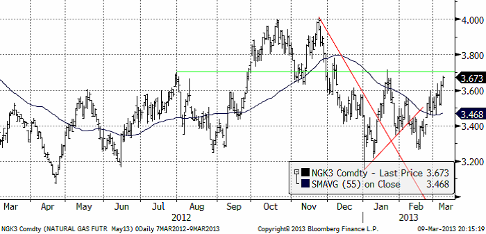 Naturgasterminen på NYMEX (maj 2013) har handlats upp hittills i mars. Motstånd ligger precis ovanför dagens kursnivå. Vi har ingen speciell rekommendation just nu. Sidledes rörelse är mest troligt.