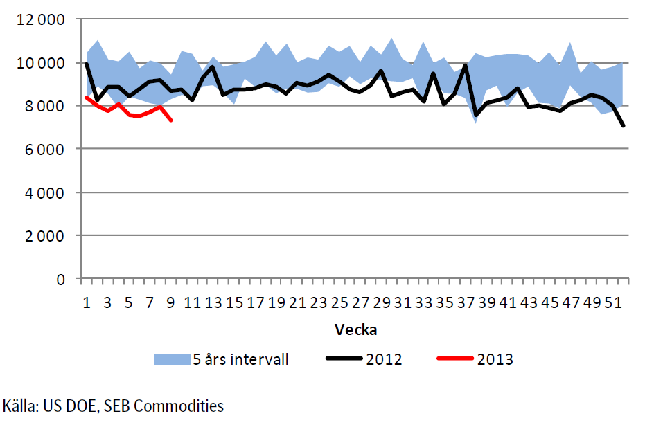 Nedan ser vi amerikanska råoljelager enligt DOE i tusen fat. Den svarta kurvan är 2012 års lagernivåer vecka för vecka och den lilla röda linjen är 2013 års nivå. Vi ser att lagernivåerna fortsätter att vara högre än de varit sedan 2007 för den här tiden på året.