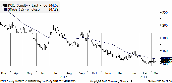 Kaffepriset (maj 2013) gick i början av månaden upp till det glidande medelvärdet, vilket triggade säljordrar. Rekylen nedåt stannade dock på 140 cent och i slutet av förra veckan steg priset återigen upp mot motståndslinjen. Det ser ut som om priset håller på att etablera en botten och konsolidera sig med den vanliga ”sidledes” rörelse som vi brukar se under sådana skeenden.