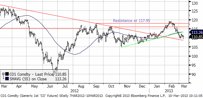 Oljepriset har fallit ner till 110 dollar per fat. Den tekniska bilden är otydlig med både brutet tekniskt stöd och att priset just nu vilar på ett annat tekniskt stöd.