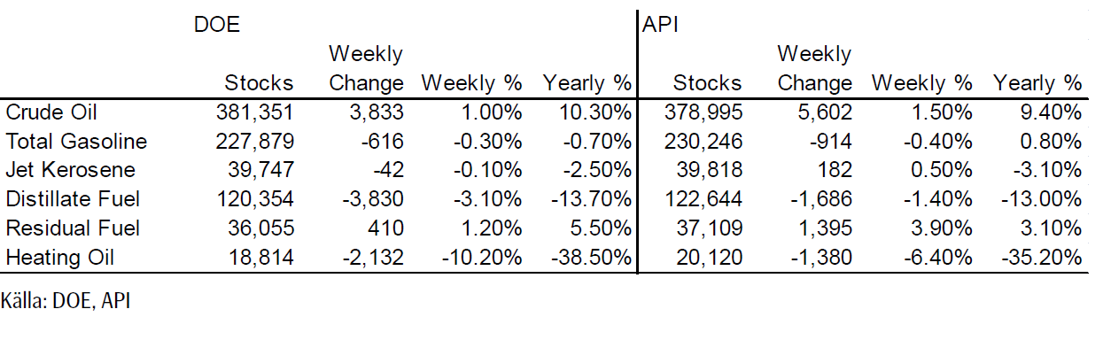 Lagren och lagerförändringarna i USA per den 1 mars ser vi nedan, enligt Department of Energy och American Petroleum Institute.