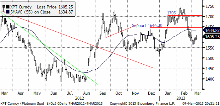 Den tekniska bilden ger stöd till vår neutrala position. Vi är positiva till basmetaller på sikt men avvaktar bättre köptillfällen alternativt väljer någon annan basmetall. Den stora triangelformationen börjar spela ut sin roll. Stödnivåer noteras vid 7600 och 7400. Nivån 7800 fungerar nu som motstånd.