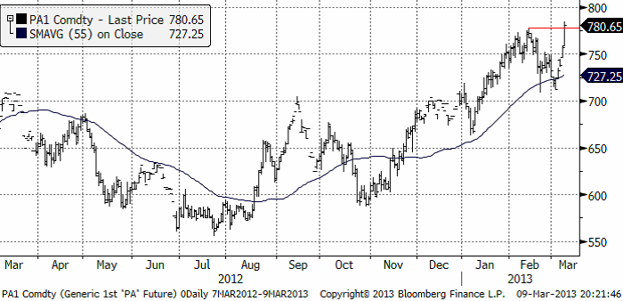 Palladium rusade i veckan som gick och stängde veckan över tidigare toppnotering. Ett sådant momentum brukar vara lönsamt att snabbt haka på, utan att tänka allt för mycket.