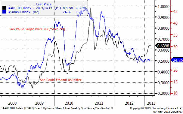 Brasiliens regering vill öka användningen av etanol som drivmedel i landet. Många bilar i landet går att köra på både bensin och etanol, men priserna har varit sådana att folk har valt att tanka med bensin. Den ökade fokuseringen på etanol har fått priset att stiga, som vi ser i nedanstående diagram, som visar etanolpriset i Sao Paulo i USD per liter. Den blå linjen är priset på socker i samma delstat.