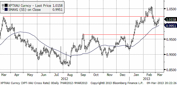 Nedan ser vi priset på platina i termer av guld, eller ”växelkursen” mellan XPT och XAU, valutakoderna för de två ädelmetallerna. Platina har fortsatt att vinna på guld.