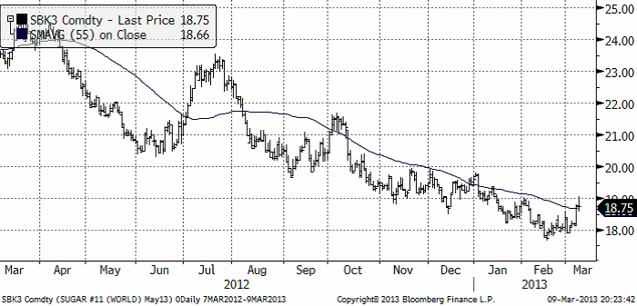 Sockerpriset (maj 2013) vände upp från kontraktslägsta i mitten av februari. I torsdags rusade priset och var uppe och rörde på 19 cent, som är ett tekniskt motstånd. Om priset skulle gå över 19 cent får vi en indikation på att prisfallet kan vara över. Fredagens prisfall efter att 19 cent uppnåtts kan dock tolkas som att marknaden behöver hämta kraft för ett nytt test av 19 cent.