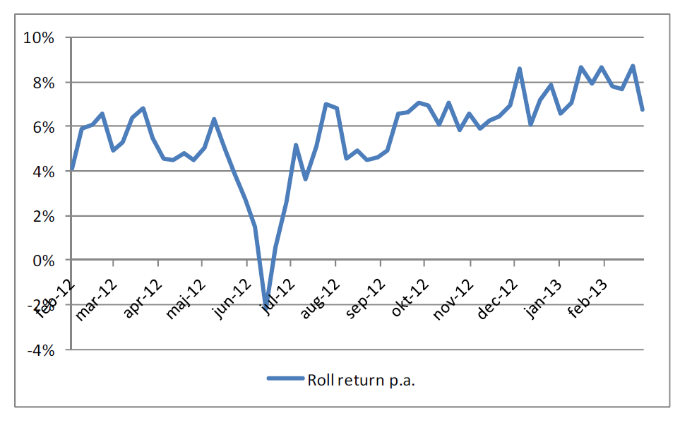 Terminer handlas till en stabil rabatt i förhållande till spotpriset. Det innebär att det går att tjäna pengar på OLJA S, även om inte priset förändrar sig. Vi ser att denna riskpremie varit stabil det senaste året och uppgår till ca 7% på årsbasis. Jämfört med en kreditobligation som ger 7% ränta, har OLJA S fördelen att om ”något otäckt” händer i världen, t ex i Mellanöstern, leder det till att OLJA S ger högre avkastning, medan i princip allt annat som t ex aktier eller obligationer, faller i pris.