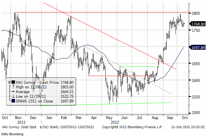 Konsolideringen har fortsatt under veckan, fortsatt utan genombrott. Förra veckan testade marknaden nästan $1800-nivån, men fallerade och handlas nu mitt i intervallet kring $1770. Vi kvarstår med bedömningen att behålla guldet om man redan har köpt, och öka eller köpa nytt vid ett genombrott av $1800. Nedan ser vi kursdiagrammet för guld i dollar per troy ounce.