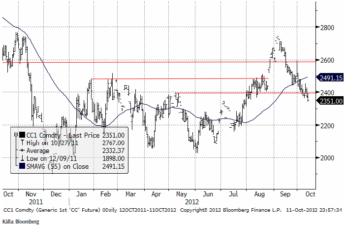 Vi har tidigare varnat för effekten efter stimulanspaketen, måste följas upp av industriell efterfrågan. Det har inte riktigt materialiserats, och priserna faller tillbaka. Vi är nu i början av det säsongsmässigt starkaste kvartalet, så en förbättring bör skönjas de närmsta veckorna. Jämfört med övriga basmetaller så håller koppar väldigt bra. Som vi nämnt tidigare är kopparmarknaden i grunden fundamentalt stark. International Copper Study Group (ICSG) redovisade en rapport gällande balansen mellan utbud och efterfrågan. För 2012 bekräftas den strama marknaden och de bedömer ett underskott om ca 400 tton, och det är tight med tanke på ett synligt lager börslager på LME om 220 tton. Det är naturligtvis inte allt, men en stor del av det som finns utanför Kina. Rykten gör gällande att minst 600 000 ton ligger i kinesiska frihamnslager. I vilket fall som helst så betyder underskottet en teoretisk lagerminskning på 400 000 ton. Risken finns därför att det kortsiktigt blir väldigt ont om koppar utanför Kina. För att det kinesiska lagret ”ska börja röra på sig” dvs skeppas från Kina, krävs sannolikt ett högre kopparpris på LME. Koppar är köpvärd.
