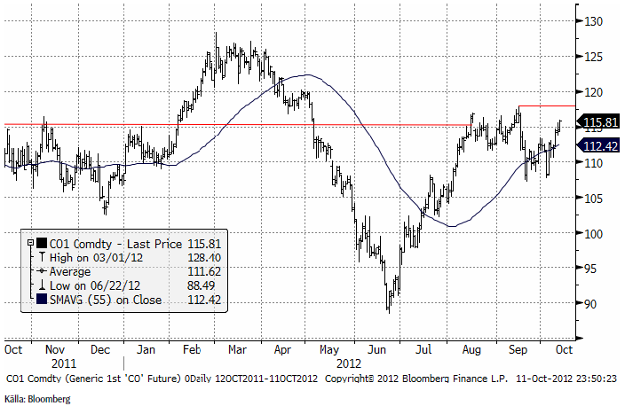 Priset på Brent-råolja har på sistone pressats upp till över USD 114/fat genom flera haussefaktorer. Extensivt samt väsentligen försenat underhåll i Nordsjön har minskat tillgången på råolja från Nordsjön med förseningar i nästan alla lastningar i oktober. Lastningar i november kommer också att påverkas och de nuvarande förväntningarna är att lastningarna i november kommer att vara de lägsta på 5 år. En annan fysisk drivkraft för Brent-råolja är för närvarande de låga förråden av oljeprodukter av mellandestillat i Europa, kombinerat med så mycket som 2 miljoner fat per dag för raffinaderiunderhåll. Raffineringsmarginalen för mellandestillat är på årshögsta eller flerårshögsta och signalerar knappheten i detta segment. Denna knapphet inträffar under en tid på året när vi fortfarande har en stor del påfyllning framför oss under de kommande månaderna. Lättoljor som t.ex. Brent är den råolja som föredras av raffinaderier när de fysiska marknaderna för lättoljeprodukter eller mellandestillat är strama. Därför stärker den nuvarande knappheten avseende mellandestillat efterfrågan på Brent-råolja.