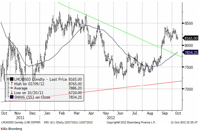 Veckan inleddes med ett prisfall på 1-1,5 % när kineserna kom tillbaka på säljsidan, efter en veckas ledighet (Golden week). Samtidigt hade USA stängt i måndags (Columbus day) så likviditeten var begränsad. IMF reviderade ner prognosen för den globala tillväxten till 3,3 % 2012 och en långsam återhämtning till 3,6 % nästa år. De tror dock på en relativt stark kinesisk tillväxt på 7,8 % och 8,2 % nästa år. Eurogruppens möte skapade oro i måndags, men beskeden på tisdag morgon, att den permanenta räddningsfonden (ESM) formellt godkändes, fick stämningsläget på världens finansmarknader att stabiliseras – och så även metallerna. Sett över hela veckan är det ändå relativt kraftigt nedåt, mellan 4 och 5 %. Sämst gick det för aluminium som föll efter Alcoas resultatrapport, där bolaget reviderade ner sin globala efterfrågetillväxtprognos för 2012 från 7 till 6 %. Koppar är den ”lysande stjärnan” med endast en marginell nedgång under procenten (se nedan).