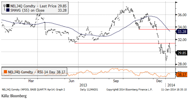 Elpriset vände upp i veckan på prognosen om det kallare vinterväder vi har nu. I fredags föll priset när det kom lite mildare väder in i prognosfönstret igen. Priset vände ner i torsdags exakt på motståndet, som gavs av bottennoteringen på kontraktet i juni. Tekniskt ser det därmed negativt ut.