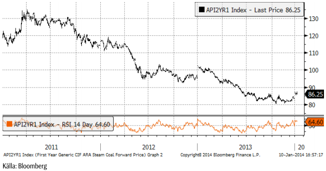 Enmånads termin på energikol steg flera procent i veckan och terminen för nästa år utvecklades också positivt. Nedan ser vi priset på energikol, det närmaste årets leveranstermin för de senaste tre åren.