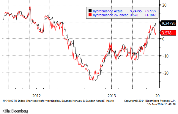 Hydrologisk balans har under hösten klättrat 20 TWh, från ett underskott på 10 till ett överskott på 10 TWh, som vi ser av Markedskrafts data. Vi ser också att prognosen för två veckor framåt har vänt när och där har vi en stor del av förklaringen till prisuppgången den senaste veckan.