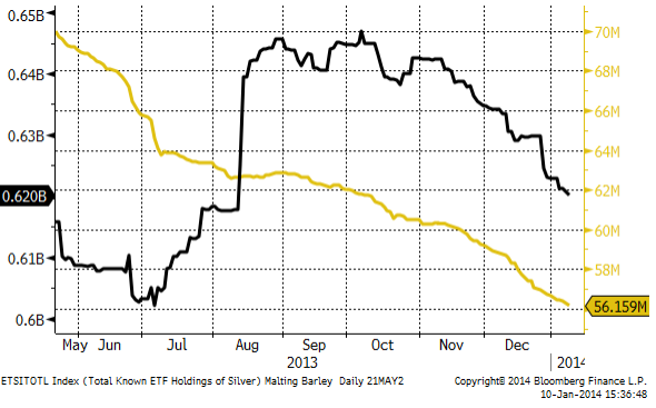 Placerares innehav av guld via börshandlade fonder fortsätter att minska. I diagrammet nedan ser vi guldinnehaven som gul linje och innehaven av silver via ETF:er visas av den svarta kurvan.