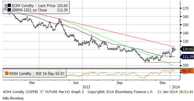 Kaffepriset har tagit sig ända upp till motståndet för den fallande trenden. Skulle priset på kaffe fortsätta bara lite till uppåt, är den fallande trenden bruten. Det betyder inte att en stigande trend är etablerad. Det är väldigt sällan en lång nedgångsfas omedelbart vänds i en stigande marknad, utan att det etablerats en botten. Sannolikheten är stor att uppgången från 105 cent till 120 nu vänds i en rekyl nedåt.