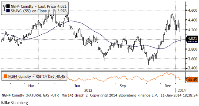 Naturgaspriset i USA har handlats upp på det kalla vädret. Det har varit och är just nu extremt kallt i USA, men det mildare väder kom in i prognosfönstret redan för ett par veckor sedan har redan börjat tina upp landet. Priset är tillbaka nere på 4 dollar, som är en stödnivå. Det mesta av prisfallet är därför förmodligen över.