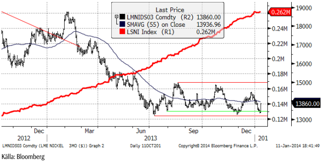Det produceras mer nickel än vad som efterfrågas i världen. Det ser vi på de ständigt ökande lagren vid LME (röd linje i diagrammet nedan). Exportstoppet i Indonesien kan minska överskottet och kanske få marknaden i balans.