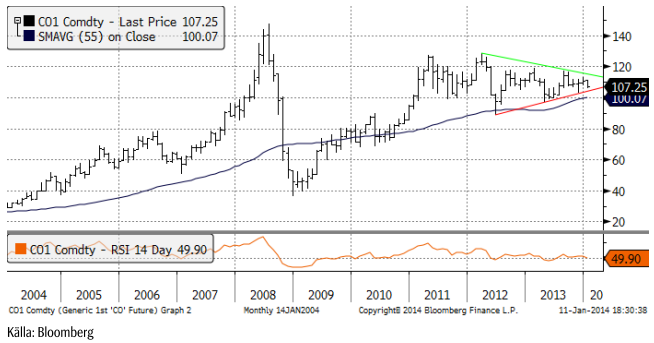 Efter prisfallet i början av året handlades oljan lugnare i veckan som gick. Tekniskt borde man se en ytterligare nedgång till ca 103 dollar.