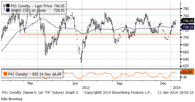 Palladium handlades också upp, men befinner sig fortfarande inom det intervall som priset legat inom det senaste året.
